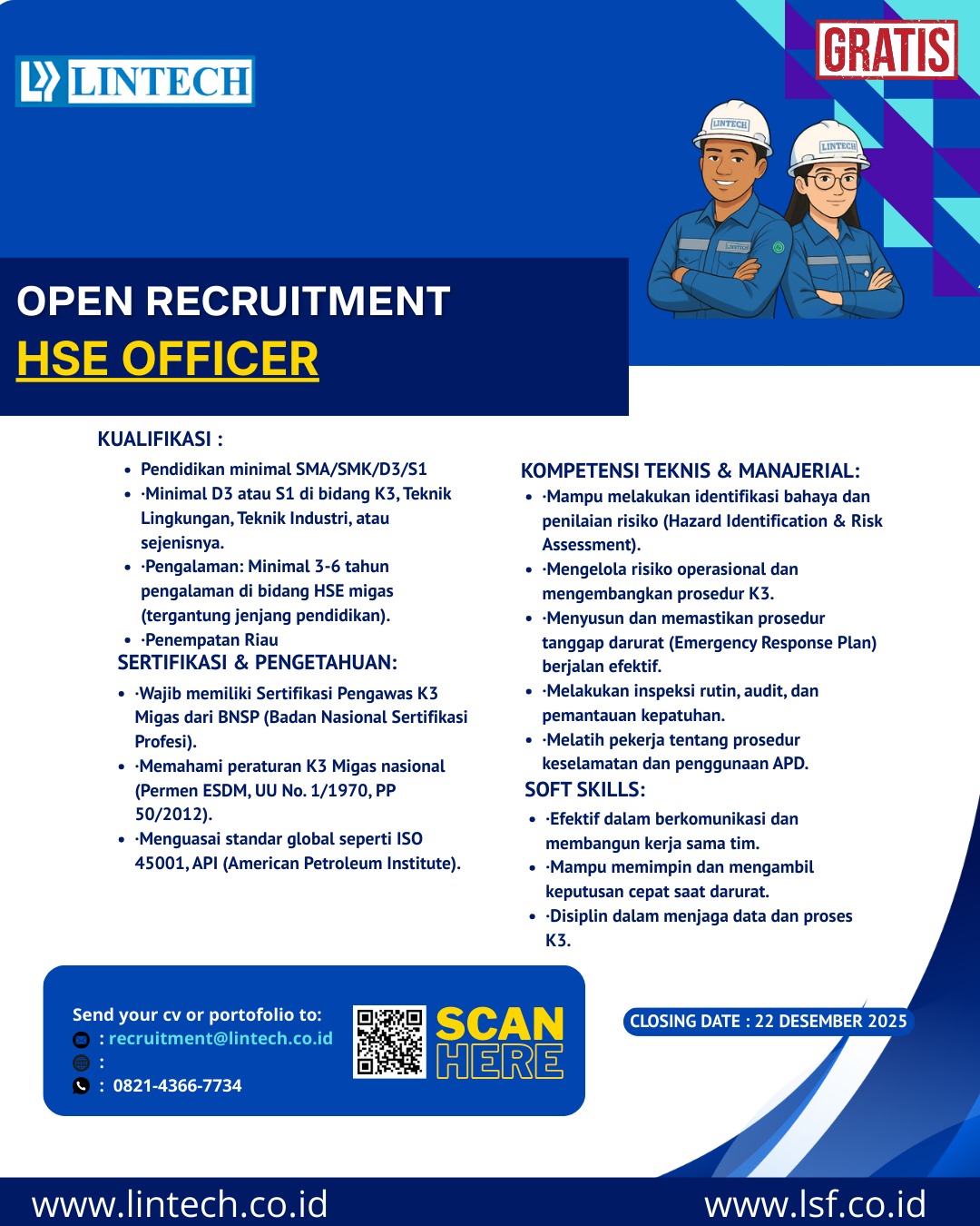 Pengalaman: Minimal 3-6 tahun pengalaman di bidang HSE migas (tergantung jenjang pendidikan).
